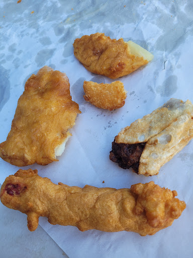 My daughter didn't eat any of the kids pack, the potato gems were cold and soft and the nuggets "tasted funny" plus it was unsalted. We opened up our first package which had 3x pineapples fritters that were soggy and very tasteless on a bed of undercooked, hardly salted chips. The chips had no crunch and were bland. The fish was so oily, the paper package had gone see-through. The batter was very thick on the fish and seemed cooked on the outside but floury on the inside and it was again, soggy. Unfortunately the fish was also tasteless. I didn't try the calamari rings or the crab sticks and I peeled all the batteries off the prawns and just ate the flesh,...