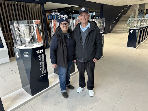 For a Father’s Day treat, I took my 89-year-old dad to Ikon Park, home of AFL/AFLW Carlton Football Club. We’ve been fans of the club our whole lives. We enjoyed a wonderful brunch in the 1864 Café (best chili scrambled eggs ever, on gluten free toast, and my pot of tea was fantastic! Dad enjoyed a barista-made latte). Then, we went on a tour of the facilities and club history, led by Tony. He was amazing. Super knowledgeable, personable and passionate. What we learned was fascinating!