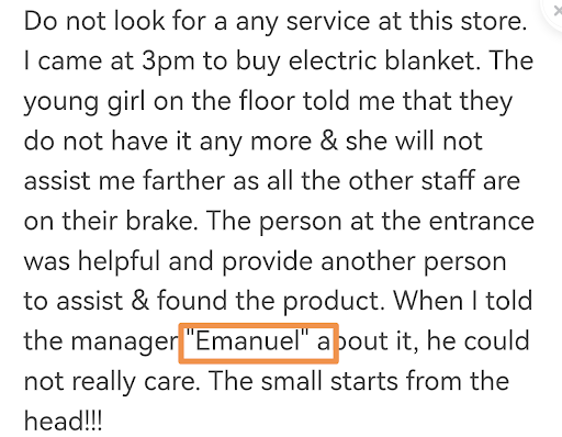 Read moreI was with my friend at Kmart. something happened to my friend made me really upset. My friend told me he asked for a price match on a few toys â something completely reasonable that many people do. What happened next was honestly shocking. The staff didn't know how to respond, so he called the manager, Emmanuel. Instead of handling the situation 'professionally', he flat-out refused the request without giving a proper reason. When asked to explain or show the policy, he simply said 'each store can decide for themselves, and express the meaning that it was a loss for Store to do price match. This felt like an excuse rather than an actual policy. The whole interaction felt really uncomfortable to witness. Emmanuel was dismissive and spoke down to my friend as if their concern didn't matter. It wasn't just poor service â it felt personal, like the decision was based on who my friend was rather than the actual request. It came across as unfair and borderline discriminatory. I have done price match at the same Store for a few times, so this is discrimination! That's why i think i should speak up! I found other customers with similar experience with this manager. Pic attached. As a customer standing nearby, I felt uneasy and disappointed. This is not how anyone should be treated in a retail environment. Kmart needs...
