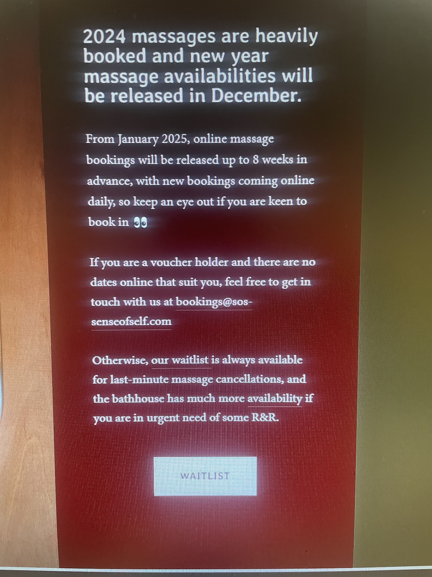 I've been trying to also book a massage but can see that must be busy! If the massage is like the Bathouse, I am not surprised! Hopefully some availability comes up soon 🤞🤞🤞