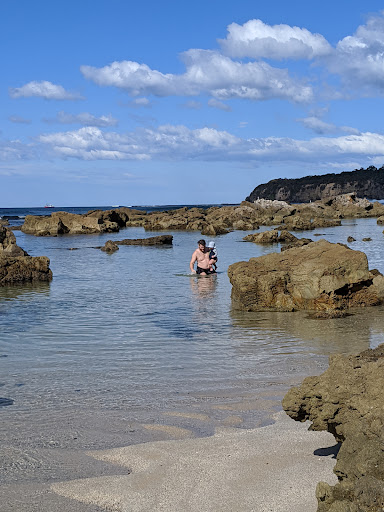 we just loved this....it was totally sheltered ....basically a natural shallow ocean pool...surrounded by rocks..some submerged but no real danger .we played with young kids in the water for hours....we played shark. lobster...crawling around in the water with kids climbing all over us...you don't need to be a swimmer to enjoy this as it's pretty shallow in most parts (I think?) so long as an adult is watching you...so much fun...and there's rocks you can climb. ..a beautiful view everywhere you look....it's not a huge area....in fact one super large extended family could take over the whole area.....bring a few chairs to sit on or just lean on a rock or lie on the sand....it was shady on the sand.. take some food along that you can carry for the 5 min walk from the car park...there are no cooking facilities at all....toilets aren't far from the...