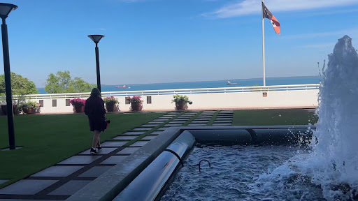 The building looks out onto the bay, with a little water feature at the front and behind that, the requisite flagpoles, with the poor old flags looking a bit worse for wear, which isnât surprising given the heat and humidity.