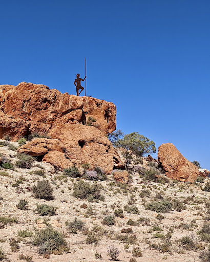 Weathered granite outcrops with striking Aboriginal statue near entrance.