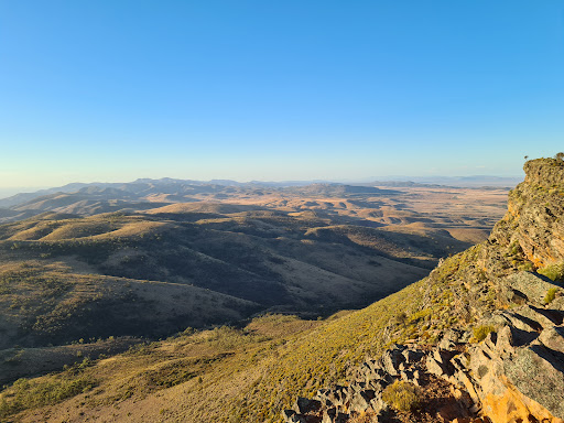 Dutchman Stern Loop hike review not the valley hike which is also at this parking space. This is a 10.5k loop hike with stunning views. The path is very well defined. It offers different brushes and trees which adds to the enjoyment of the hike. As a loop hike it loops around the hill and is always changing, which also adds to the hike. I'm here in June, so I'm bundled up as it's pretty cold. I have hiking boots but walking or running shoes are just fine. The hike does vier off to some edges. I believe it was about a 500 Meter elevation, which is very gradual. I hiked this in 2.5 hours. A 15 minute lunch at the top and a 15 minute look in a few different places makes it 2 hours of hiking. I work out 5 days a week and would rate this as easy. Although, if your BMI says you're obese, you might find this to be moderate l. I would say ok for kids, but the edge does veer close to the trail in some spots. I spotted lots of Gray Kangaroo's, some reds, two golden eagles, lots of birds, Australian ringneck parrots, goats and some sheep blocked the way back for about 5 minutes. All the animals came out an hour before sunset. Also, it's cold so they are out early. I would recommend at least 500ml of water in the winter months. Bring more if visiting in summer....