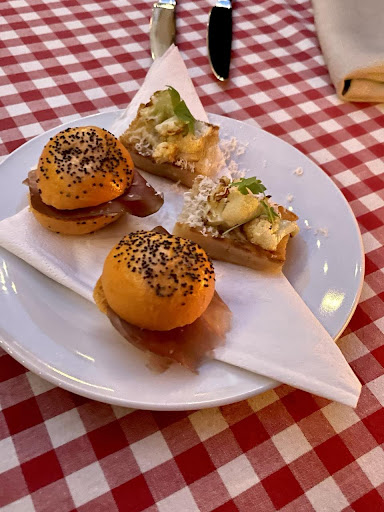 First up were the canapés: Crispy bruschetta with cauliflower & parmesan and Mini brioche bun with bresaola & pecorino cheese