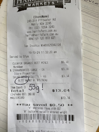 Ā Ā Ā Read moreWhile the fruit and veg are good quality which is why I go there, where Harris Farm Manly let themselves down is in their customer service (non existence). They come across like robots doing a job they donāt really enjoy. I went last night, there was a big sign eggs $7.99 (600g) however I was charged $10.99. They apparently had the wrong sign on the eggs but how was I to know when the eggs I bought and on the sign were for 600g eggs. The salmon had the wrong sign on it too. Above the 400g salmon sign (in small print without my glasses) was 500g salmon so I picked it up automatically thinking the sign matched the above product. And I was over charged for the grapes. While they did refund me for grapes (overcharge) and I returned eggs and salmon because I thought I was paying one amount and charged another. Care factor zero that their ticket price didnāt match the item. So look at your docket because the prices for items are misleading. I note other people in the reviews have mentioned this too. This is the first time Iāve checked my docket, however other times Iāve shopped here Iāve often been surprised at how much my groceries have come to. This could be the reason why. In future Iāll be...