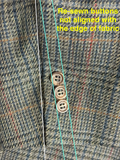 Unfortunately, they didn’t note the instruction on the ticket, and when I returned a week later, the buttons had been sewn through the lining—exactly what I asked them not to do. They agreed to fix it, but it took another week. When I finally picked it up, the buttons were misaligned and didn’t match the placement of the original buttons on the other sleeve.