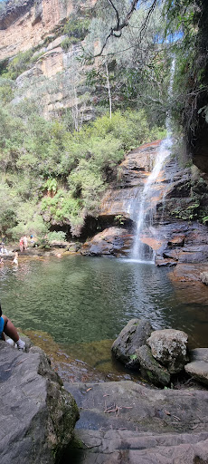 Only a 10 minute walk down an adventurous and dynamic trail full of views until you arrive at the lovely open basin with high and grabbing waterfall above. On the way down the main trail, you can find many mini attractions of the initial waterfall to stop at, with many smaller waterfalls, water holes, creek and embankments of sand under trees for picnics and play with children, family, friends & pets. The trek alone is worth while, but the initial walk into the main waterfall 'arena' can be breathtaking if you're present. Be warned, the water is a cold-plunge/ice bath experience! Quite deep at over 2m in most spots especially around the middle it may get up to 5m or deeper. But all ages seemed to still enjoy it with pool toys...