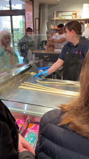 Sticky is one of those places that makes you smile before you have even tried anything. The shop is compact, bright and full of sweet, fruity perfume. Through the window you can watch the team working hot sugar on a steel bench, folding in colors, stretching ropes, and rolling them into perfect cylinders. It is oddly hypnotic to see the picture appear inside the candy as they cut the pieces. Kids press up to the glass, adults pull out phones, and the staff are happy to explain what they are making while they work. It feels more like a little show than a shop visit, which is half the fun.