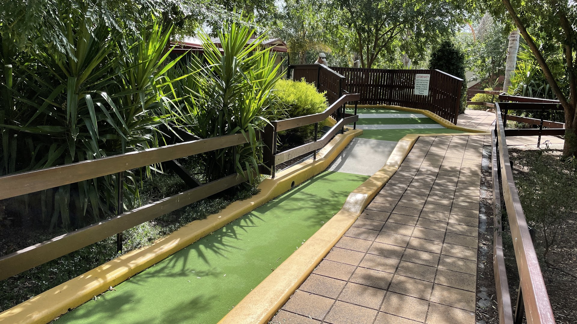 The mini golf course is in desperate need of renovation, the putting borders on each course have paint missing and chunks taken out of the borders and the starting squares have multiple divots in them which makes it difficult to keep your ball still when your trying to putt, the dinosaur statues need renovation badly, the speakers inside them are crackly and need to be repainted and repaired, and the way the course is designed with all the water in between the course means your constantly swatting away mosquitoes and bugs that live in the water which is very frustrating.