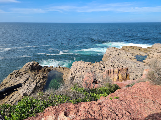 On the bikes we headed out to Tura Head. Although a short ride it took us to an amazing view of the headlands with red rock being smashed by white wash waves and an aerial view of the rockpool below. It was worth the ride through the scrubland to reveal such an overview of the ocean...