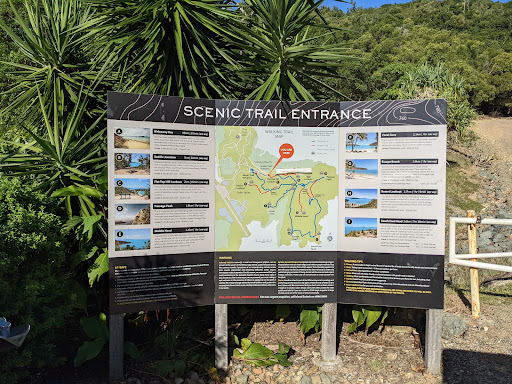 Getting to the route: There are two start points. One is the Scenic Trail Entrance and one is the Resort Trail Entrance. Both entrances are accessible from the shuttle bus stop "Whitsunday Apartments" by either green or blue shuttle (both free). The green is a shorter loop with fewer stops and so would get you there quicker. There is also a Green stop next to the ice-cream parlour across the road from when you get off the ferry. Alternatively you can walk from the ferry terminal which is about 15minute walk down a straight road.