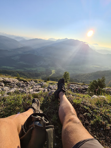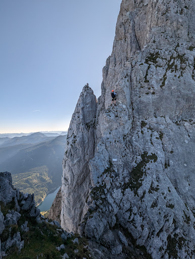 Read moreDieser Klettersteig ist einfach super. Gestartet sind wir vom Parkplatz um 4:30. Nach dem Zustieg und einer Pause haben wir dann mit dem Klettersteig um 7 Uhr begonnen. Da Montag war und keine Ferien, waren wir die ersten an der Wand und sind auch niemandem begegnet. Allerdings war es an diesem Tag sehr schwül und heiß. Außerdem ist das in der Gegend der einzige Berg ohne jegliche Quellen, und somit ohne Möglichkeit Wasser aufzufüllen. Dies wurde uns fast zum Verhängnis, da wir unsere Wasser-/Getränkereserven schon an der Himmelsleiter fast vollständig aufgebraucht haben (4 Liter). Von dort aus geht es aber noch nen ganzes Stück hoch, und dann den gesamten Berg wieder runter. Schatten zu finden ist auch fast unmöglich. Der Steig ist sehr abwechslungsreich und bietet einen wunderbaren Ausblick. Die Passage (C/D glaube ich) nach der Himmelsleiter kann man umgehen, ist aber gut machbar. Den Abstieg vom Berg würde ich im Leben nicht als "Wanderweg" bezeichnen. 😂 Im Prinzip ist das nen Haufen großer Steine mit Pfeilen drauf die den "Weg" Kennzeichen. Wer also denkt dass er nach dem Klettern ruhig einen Weg runterspazieren wird, hat sich geirrt. Insgesamt ist das ein sehr toller Steig, bei dem sowohl der Auf- als auch der Abstieg Spaß macht. Wichtig ist halt dass man wirklich genug Wasser mitnimmt. Wir waren etwa 8h unterwegs (Parkplatz - Gipfel - Parkplatz) und das bei über 35°C und kaum Schatten. Nach einer kurzen Pause in der Wirtschaft sind wir das letzte Stück dann mit der Gondel wieder runtergefahren weil wir einfach nur noch in den See wollten. Technisch ist der Steig nicht wirklich schwer. Hier ist eine normale bis gute Kondition wichtig. Wünsche allen die da noch...