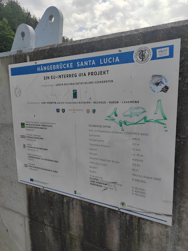 Read moreZanimiva gradnja mostu 140 metrov dolg in 45-tonski most je edinstven v Avstriji in spektakularna atrakcija. Viseči most Santa Lucia v Aichu blizu Pliberka je eden najbolj znanih kolesarskih mostov vzdolž Dravske kolesarske poti, ki se razteza čez 60 metrov globoko zalivsko jama Feistritzbachgraben. Z razponom 140 metrov je jeklena kabelska konstrukcija prava paša za oči – tudi za družine in enodnevne izletnike. Lahko bi le malo preverili stanje lesenih desk ki odstopajo in prečnih lesenih tramov. Priporočam da obiščete to...