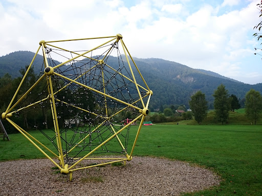 Die Liegewiese ist groß und sehr gepflegt. Es gibt einige Bäume, somit auch Schattenplätze. Dass die Wiese in der Früh noch feucht ist, ist klar. Wen das stört, der muss etwas später kommen. Ganz rechts gibt es einen Kinderspielplatz mit Rutschen, Kletterturm, Klettergerüst, Karussell, Netzschaukel, Wippschaukel. Direkt daneben Umkleidekabinen.