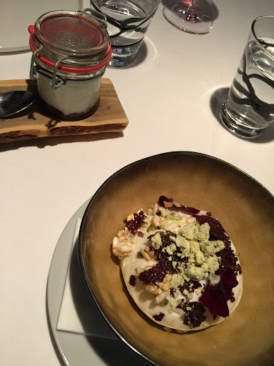 Vorspeise 14 Euro , Steak mit "Beilage" 32 Euro (Medium bestellt), "Rare" serviert" und Nachspeise ebenfalls 14 Euro. Fettige Fingerabdrücke am Tellerrad von der Vorspeise bis zur Nachspeise.
