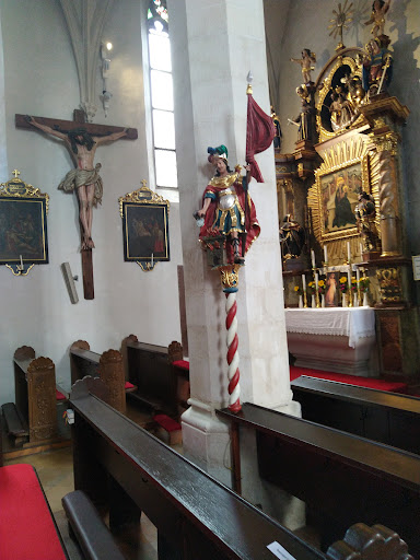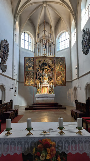 Schöne, gepflegte, spätgotische Wallfahrtsbasilika mit dem spätgotische Doppelflügelaltar aus dem Jahre 1480 und dem gotische in Tempera auf Holz gemalten Seiten-Altarbild aus der zweiten Hälfte des 15. Jahrhunderts. Es zeigt das Gnadenbild "Unserer Lieben Frau mit sechs...