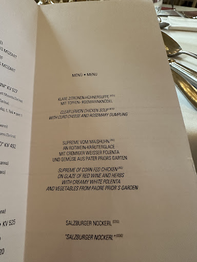 We have been at dinner yesterday night. The entrance hall was elegantly decorated, toilets were clean and had supplies. At the entrance we were met by young lady cashier, who was friendly and gentleman who greeted us in very friendly manner, speaking very good English. I guessed he was in charge , because later he kept coming and asking if everything is ok, after we been seated. It’s our second visit to this concert dinner. The musicians and singers did their best . Very young female singer and male singer pleased us with their performances. The only thing I noticed , they didn’t wear wigs, which would complete their costumes very nicely . One of cello players had black sports shoes . The musicians also didn’t wear wigs. It used to be different 11 years ago. Then they all wore wigs, nice costumes and shoes that suited those clothes . I pay close attention to details . If they making show, they should wear full costumes , because actors and singers in real opera wouldn’t do that , ho on stage with sports shoes and without wigs . Food wasn’t great . Soup with two Knödel, which is favorite by mostly German speaking nations is not so favored by Americans or other tourists from other parts of the world. As main dish we were served chicken thigh with polenta and some carrots. Also didn’t look very appealing. The knife wasn’t sharp to cut chicken , so I struggled, because our table was wobbly and I was afraid if I push knife harder that table will triple down . I am not a Fan of polenta , do I ate only chicken.then came dessert , it tasted like sugar blended into foam and to make it look better they flamed it brown on top . I think, 11 years ago we ate the same dessert. But it was very big portion, baked in oven, so it was really crispy . I couldn’t eat dessert . Overall, it worth to go to concert dinner, just to enjoy music and opera, but the food was real fiasco. They should change their menu completely. The personnel were really nice, friendly . Our waiter Patric spoke with some mannerisms, in good English , but I guessed he can’t speak German, although my man said he is German, Patric kept speaking English. But he was pleasant . I found bag in toilet , gave it to gentleman in suit, who was in charge, he came later to table to tell that lady came for her bag...
