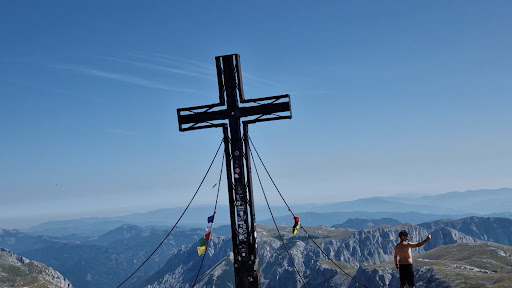 Hochschwab Gipfel (2277m): Csúcskereszt, 2277 méteren. 8 km-t tettünk meg idáig. Panoráma minden irányban. Innen mi nem visszafelé indultunk el hanem tovább lefelé a másik oldalon, már csak azért is, hogy ne ugyanarra menjünk vissza legalábbis teljesen ne + talán látunk újabb szépségeket is! Ami így is lett!