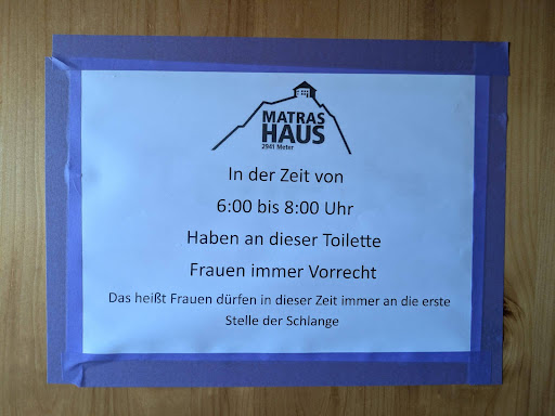 Read moreWaren die letzte Nacht von 20.9.25 auf 21.9. 25 am Matrashaus zur Übernachtung, bevor die Pforten geschlossen wurden wegen Saisonende. Das Ende kam apruppt der Wirt sagte uns beim Abendessen, dass wir am nächsten Tag alle bis 8 Uhr das Haus verlassen müssen, ab da ist geschlossen, dies hätte man vielleicht auch im Vorfeld mitteilen können, da wir bereits im, Dezember 2024 gebucht haben. Am Ankuftstag gab's natürlich nicht mehr alles, dies wäre kein Problem für uns, aber der Wirt hat uns streng mitgeteilt, dass wir um 18 Uhr zum Essen im Gastraum sein müssen, da gibt's dann kein herumlaufen mehr, da wird serviert, Getränke gibt's zu dieser Zeit auch nicht, also vorher oder nachher holen, das einzige Essen von der Karte waren noch Spagetti Bolognese oder mit Tomatensauce um 15,80€. Wir waren im 17:45 Uhr im Gastraum, es waren noch viele draußen und in den Lagern, aber der Salat war bereits leer, auf Nachfrage hieß es, es gibt keinen mehr, außerdem war er ein Geschenk des Hauses. Frühstück war nur dieses Mal mit Joghurt zum Müsli, da sie es selbst nicht mehr essen können, wegen Saisonende, ansonsten wäre dies mit Milch, übrigens Joghurt wieder ein Geschenk des Hauses, Frühstück ist überschaubar, komplett ohne Käse und Wurst nur Butter und Marmelade. Das Wasser für den nächsten Tag müssten wir am Abend mitbezahlen, 1,5 Liter kosten hier 4,80€ und man bekommt es erst in der Früh, es ist kein Wasser im Lager erlaubt. Generell gibt's ganz eigensinnige Regeln am Matrashaus, es ist am WC so, dass am Plumpsklo von 6-8Uhr früh Frauen Vorrang haben, heißt Männer stellen sich an, Frauen dürfen vor. Nur 2 Plumpsklo vorhanden bei einer Lagergröße von 104 Personen, keine Seife, dies ist ein Luxusgut lt. Hütten Wirt, aber nach den super tollen Plumpsklo möchte man sich die Hände eigentlich mit Seife waschen. Eigentlich ist es oben ansonsten sehr schön, Weitblick ein Traum, Sonnenuntergang und Sonnenaufgang ein Traum, hatten wunderschönes...