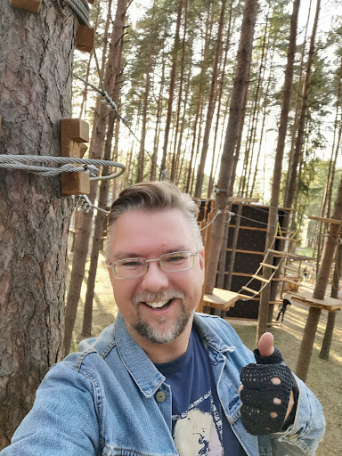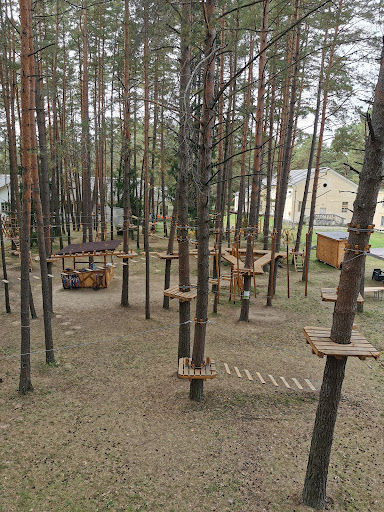 Read moreЗамечательное место, которое, судя по всему, только-только открылось и набирает обороты. Вся снаряга с иголочки, все этапы аж блестят. На заезде штурман орёт "вправо 90", лучше предварительно скидывать скорость, чтобы попасть в поворот. Обязательно брать с собой сменку наверх, местами на соснах проступает смола, и это не гламурные лазалки в супермаркете. Не помешают спортивные перчатки - руки от верёвок немного горели. На территории домик с надписью "Кафе" был закрыт, но лежат флаеры с доставкой пиццы откуда-то из окрестностей. Воду и возможно еду стоит брать с собой, чтобы не ждать доставку. Не помешает человек, который будет бегать по земле и снимать на телефон или длиннофокусный объектив, как основной состав корячится на препятствиях. Три трассы для взрослых, прохождение заняло около двух часов при офисной спортивной подготовке. Инструктора на позитиве. Приятное внимание к мелочам: умывальники и дозаторы для мыла заправлены водой, туалетная бумага в достатке. Всё хозяйство располагается на территории старого детского лагеря, где можно пилить антуражные фотосессии в заброшке. Для охраны территории есть БТР и большеухая собака. Удачи и...