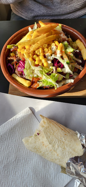 The ingredients are fresh and combined to create a tasty chicken wrap. The shop is clean and well kept.