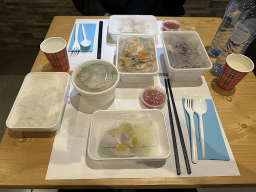 Cost: âŹ46 for two dumplings, a chicken and veggie stir fry with white rice, a noodle soup, a shrimp wonton soup, and two bottled waters.