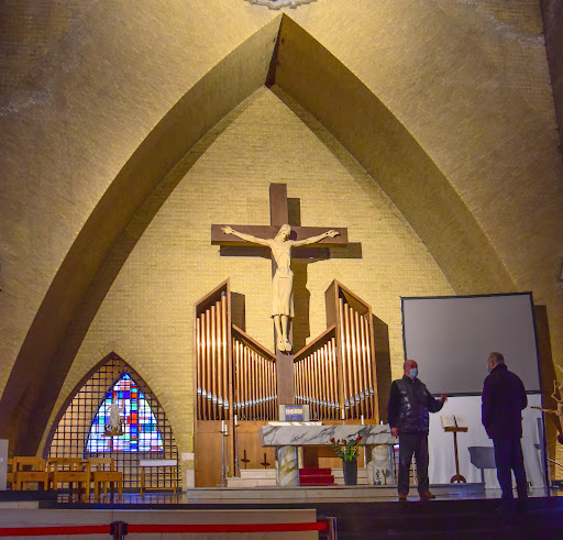 Read moreDeze kerk kan je steeds bezoeken via het hellend vlak aan de linkerzijde. Het is een moderne kerk met verwijzingen naar de gotiek. Voor de kerk is er een pangang. De inrichting is sober met stemmig gekleurde, abstracte glasramen. De belichting in de kerk is sfeervol. Het was de eerste keer dat we een spatscherm met aan de bovenkant een kruisbeeld gezien hebben. Het gebouw...
