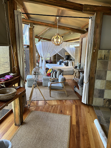 I really enjoyed staying at this camp. The setting on the water was magical and all activities are water based or on foot with no game drives. We loved the mokoro ride (although it sadly wasnât a traditional wooden one) and the walking safari and I would highly recommend both. Camp Okavango sits just outside the National park making it possible to do these highly memorable activities that you cannot do at other camps. We were also unexpectedly delighted by the bird life. Iâm not a person that gets excited by the usual water birds but there were so many colourful, gorgeous, feathered friends both around the camp and seen from the water. Possibly the highlight was flying in and out of the camp with the most incredible views of the delts below us. The helicopter ride back to Maun was particularly good as we were low enough to see wildlife. Amazing!||The room was absolutely stunning and ridiculously huge. We had plenty of electrical outlets, there was wifi, tea and coffee, and a lovely big double shower. The heat in the room and on the verandah during the day was a bit of an issue, and limited the time we could spend in it, but the outdoor public lounge areas were also beautiful and shady. Unfortunately we found that getting to and from the room was highly inconvenient after dark because we had to be escorted and there just werenât enough people around to escort you when you wanted to go. Some rooms were a very long way from the public area and so it would take ages for a guide to take guests there and come back to escort others. This needs working on, but otherwise the friendly service from the staff was very good.||The camp wasnât shy with offering guests alcohol and sunset drinks around the camp fire was wonderful. The food was good and one evening we had a bush dinner which we thoroughly enjoyed for the setting under the stars and another big campfire to sit around, however as a general note we didnât love that all dining was communal with everyone seated at one long table. We met some wonderful people, but we didnât have as much time for just the two of us as we would have liked, and it made it difficult to get an early night which was badly needed due to the early starts for safaris.||Overall, I would recommend this camp, and it was pretty...