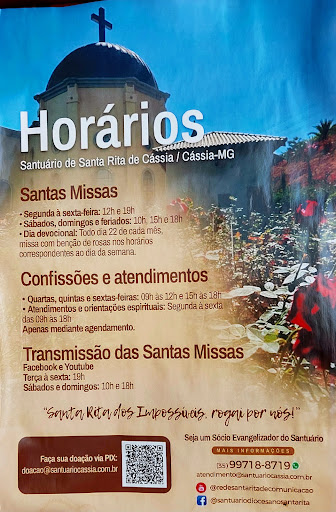 Read morePasseio da região que vale a pena ser realizado, para aqueles que são devotos é uma oportunidade única. O espaço é aconchegante, há um estacionamento enorme para carros e motos e um para ônibus separado. Ao entrar na igreja o pé direito é alto possibilitando um ambiente fresco e claro. A construção não segue muito o das igrejas tradicionais em construção góticas, porém, mantém as pinturas e os vitrais que são maravilhosos. É possível visitar de perto o santíssimo dentro do altar, local em que será realizado a missa com poucos visitantes. A casa de santa rita também é um espaço a se visitar que mostra como ela vivia e também tem um cantinho para escrever seus pedidos e orações. As lojinhas estavam algumas abertas e os preços são bem parecidos umas com as outras. O restaurante maior fechou por volta das 12h30 quando visitei e não sei se costuma ser esse o horário de costume. Os banheiros são bem acessíveis, amplos e limpos; há dois blocos de banheiros o da entrada que você consegue visualizar do estacionamento e o que fica mais próximo do restaurante (não dá nem 2 minutos...