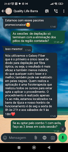 Read moreQue experiência incrível eu tive na quality life!!!!! Eu fui muito bem recebida, desde a recepção até o serviço de spa com a Luana. Todas as meninas foram muito simpáticas… o serviço é excepcional. Luana é uma profissional excelente, super educada e solícita. No fim, após a hidromassagem, as meninas me deixaram a vontade para tomar a ducha e me arrumar no meu tempo. Minha primeira experiência de spa, e com a quality life não poderia ser mais perfeita, com certeza...
