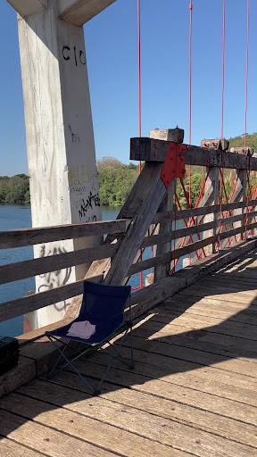Read moreÉ uma linda ponte, que tem como ponto favorável o cenário e sua arquitetura, porém ainda não foi reformada, continua interditada. Tivemos que cruzar a ponte de alvenaria e entrar por Chavantes, coisa de um minuto. As águas do Paranapanema são de uma cor e transparência fantástica. Por lá sempre terão algumas pessoas, causando uma impressão estranha, mas fomos tirar fotos e a única coisa que realmente queriam, era exibir seu talento nadando nas aguas do rio ou subindo pelos cabos de aço da ponte, por sorte ninguém saltou de lá, pq é arriscado 😶 Um lindo ponto turístico, pena que abandonado pelos órgãos públicos, tinha alguns vendedores ambulantes com água e refrigerante caso...