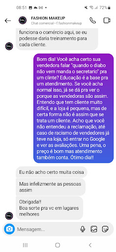 Read moreEu sempre compro na Fashion Makeup pois gosto da diversidade de produtos. Sempre fui super mal atendida pelas vendedoras mas dessa última vez foi a gota d água p mim! Fui com meu marido e como a loja estava cheia eu pedi p ele ficar na porta do lado de fora me esperando enquanto eu fizesse minhas compras. Cheguei no caixa e o moço que estava passando as compras apontou na câmera com o dedo para o meu marido pedindo p uma vendedora ir até ele vê o que ele fazia na porta pois tinha cara que queria roubar a loja. Essa loja é extremamente racista! Meu marido é um homem preto e eu sou uma mulher branca e loira. Nem imaginavam que o homem que estavam falando enquanto passava minhas compras era meu marido. Eu só não deixei minhas compras p trás pois não quis dizer nada ao meu marido p evitar confusão. Porém NUNCA MAIS NA MINHA VIDA eu piso nessa loja! Vendedoras mal educadas, mal humoradas, apáticas e agora preconceituosas! Compro na Afife, na Vip makeup, na Sousa bijou, compro até na mão do perigo da série todo mundo odeia o Cris mas JAMAIS VOLTO A...