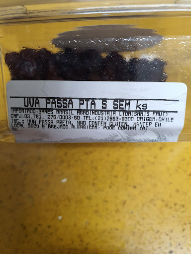 Atenção celíacos e Alérgico a Glúten Eu não compro mais nada deste hortfruit, comprei um produto (uva passa) que é embalado pela loja e um erro de etiqueta que fiquei horrorizada. Como pode um produto constar na estiqueta que não contém Glúten porém diz que : Alérgico pode contém trigo Meu Deus que falta de responsabilidade com o consumidor. Que falta de conhecimento E pior liguei para esta loja e os responsáveis nem me retornaram. O pior de tudo isso que só notei depois que fiz dois bolos de banana e um bolo de chocolate perdi vários ingredientes e ainda contaminou toda minha cozinha Meu forno, meu mixer, minhas tigelas enfim quem for celiaco e Alérgico nao compre produtos embalados por eles. Sao muito irresponsáveis Eu nao volto mais lá.
