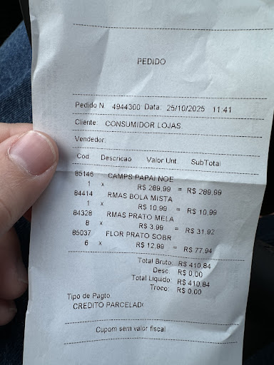 Finalizei a compra e ela perguntou se eu queria CPF na nota. Falei q não. E ela me entregou um recibo sem valor fiscal