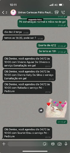 No dia 19/11/2022 estive na unidade do shopping pátio paulista da Unhas Cariocas, já havia ido nesta unidade anteriormente e sido atendida por outra profissional e, em outra unidade também. Como nunca tinha tido nenhum problema e já conhecia o serviço que anteriormente atendia o que pregava resolvi voltar. Havia agendado atendimento para as 18h 40min, porém meu companheiro me ligou às 18h 06min e informou que havia finalizado seus negócios e voltaria mais cedo pra me buscar. Neste momento retornei a unidade e resolvi cancelar o agendamento, pois não conseguiria esperar até o horário agendado. Naquele momento a recepcionista perguntou se eu só poderia ser atendida naquela hora e eu assenti, como não havia disponibilidade segui com o cancelamento. Quando saí da unidade a profissional da unidade me abordou informando que iria me atender. Devido a situação, retornei a unidade e aceitei prosseguir com o atendimento. A profissional não me pareceu experiente ou saber lidar com o manuseio dos equipamentos, ela me machucou desde o lixar das unhas até o retirar as cutículas, não foi apenas em um dedo que ela o fez sangrar, mas cinco dedos ficaram machucados. O esmalte que escolhi foi o branco, super mal esmaltado, unhas borradas, cutícula mal tirada e cinco dedos machucados por R$ 50,00. Eu fiquei chocada com a falta de profissionalismo, respeito e empatia com o ser humano. Não recebi um pedido de desculpas sequer, a profissional tacou um monte de acetona enquanto meus dedos sangravam e ardiam. Fiquei com esmalte até o peito do pé e não me ofereceu a opção de lixar ou esfoliar os pés. Se arrependimento matasse acho que hoje teria caído dura no chão, pois com certeza não recomendo e me arrependo imensamente de ter passado por está...