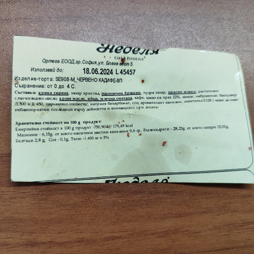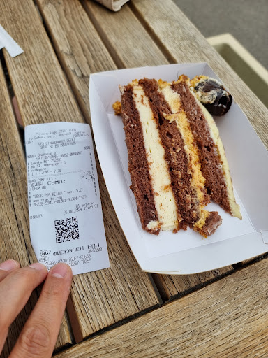 Бях изненадан много неприятно от този обект! Отидохме към 19:10 (което е видно и от касовата бележка) и поръчахме едно парче Бяла Неделя, тъй като тортата която по принцип предпочитаме (Сахер), не се предлагаше! Когато ни попитаха дали е за тук или за вкъщи, отговорих за ТУК. Веднага ми беше разяснено (да си знам), че до 10 минути прибират масичките (нищо, че работят до 20 часа)!!! После получих парче, което беше с дебелина не повече от 2-3 см.! На всичкото отгоре, след като пробвах от тортата, се оказа доста стара, тъй като беше суха и горчива! Оплакахме се на персонала и не ни предложиха да я заменят, нито искаха да ни покажат срока на годност! След 15 минути разправия и искане на разрешение от "някой си" по телефона, ни беше показан срока на годност, който беше до същия ден! В крайна сметка изхвърлихме парчето торта (както и реално 7.70лв.) и останахме разочаровани! Няма...