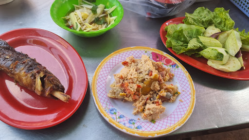 The place I landed on was the first place grilling food (turned out to be fish) on the left side of the street/opposite side of the main plaza building. About a block in. They don't speak any English (not that they're supposed to). I pointed to the fish, and they showed me the Cambodian money it cost (presumably). I only had dollars. I showed a $5 bill, and they gladly accepted.