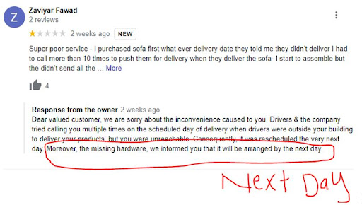 [Answer to the owner response] I was expecting this response from the owner. Firstly, the exact wording of your sales representative was, "Sir, we don't have this sofa on display, but we have it in our warehouse." Therefore, the sofa I showed him was available in stock. Secondly, I spent less than 15 minutes in total in the store, and I can share my mobile location logs if you wish. Thirdly, your sales representative told me that the sofa I purchased was exactly the same as the one I showed him in the advertisement, except that it had a reversible L-shaped seat. I reconfirmed his statement at least three times before making the payment, and he repeatedly assured me that he was providing me with what I requested.