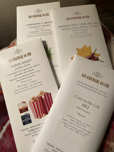 Read moreI recently received my first order of products from The Organic House, and from beginning to delicious end, everything about the experience has been top-notch. I had several email interactions with the owner and was blown away at the speed with which she replied to my inquiries. When the owner is corresponding with you at 9pm on a Friday night, you know for certain that this business is a labour of love. Customer service was absolutely 5-star and the owner could not have been lovelier. I came for the vegan, organic, non-gmo, ethically sourced, Canadian, woman-owned aspects of this business and stayed for the amazing chocolate! This chocolate lives up to the hype. As someone who did not love dark chocolate because of the bitterness, I can truthfully say that TOH chocolate is far superior to anything Iâve tasted before. No bitterness and richly satisfying, a few squares as a dessert is a decadent treat and deserves to be enjoyed slowly with no distractions. This is real food, not junk chocolate. And the flavours (I went for the lavender maple and movie night) are surprising and super smooth and delicious. I purchased a couple of the white chocolate bars as a novelty for their intriguing flavours and they are outstanding! The Corn on the Cob BBQ is totally addictive (sounds like a weird combo but trustâŠso good) and the Mango Chili Lime Sea Salt gave heat and sweet and salt in a delicious, creamy bite. Savour all the products slowly and mindfully if you can and really appreciate the process it takes to go from cocoa bean to delectable chocolate and the care that went into it....
