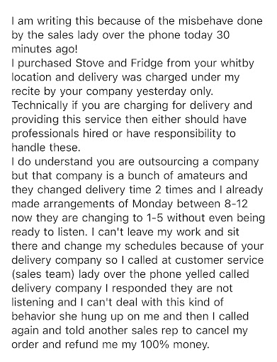 Not once was I given the option to return or exchange the appliances, or even just cancel delivery and pick-up the appliances myself. I received absolutely no customer service. Rather than being solution focused, Francis only seemed focused on asserting himself.