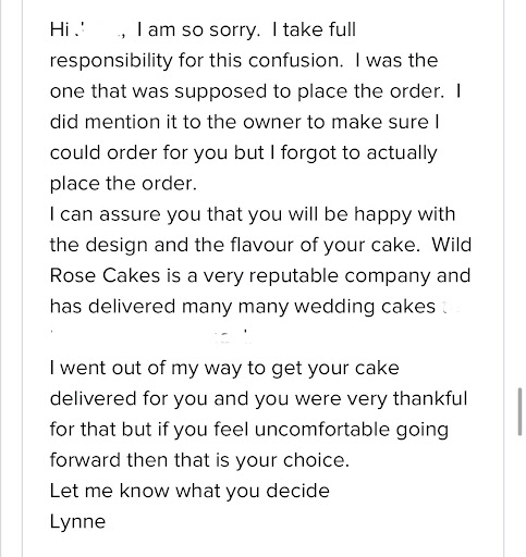 We consistently had issues in communication. First was when I placed an order for a flavour sample in order to choose flavours for my wedding cake. We emailed back and forth for a while. After settling on a flavour, I was asked to provide dates that would work for pick-up. I provided 3 but then didn't hear back by the time all the dates had passed, so I sent a follow-up email. Lynne apologized and said she forgot and then confirmed it would be ready for pick up that Saturday 10-2. On the morning of the pick-up for this sample cake, I decided to call to just make sure that everything was ready as discussed (because I am a make a list and check it twice kind of person)...which is a good thing I did, because it turns out that our sample cake was not made and the kitchen did not even know that we had placed the order because Lynne forgot to tell the kitchen. We had to rearrange our day (in the midst of wedding planning season) to accommodate this miscommunication as they said they will still be able to make it but it won't be ready until the end of the day instead of the earlier pick-up time we had discussed in emails. When we arrived to pick up the cake, there was no apology or acknowledgement of the error from their end. I sent an email after this whole situation citing my concerns around communication as the order will be for my wedding cake, a much higher-stakes situation. She apologized but then ended it with a weird passive aggressive remark that stated that she "went out of [her] way for us" (to fix HER error mind you), then jumped to the conclusion that we would be cancelling our order (???)...when I was just asking for some accountability and reassurance (see screenshot).