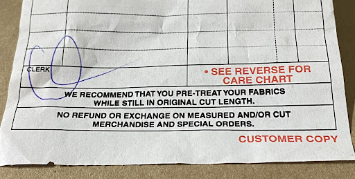 They argued the fact that the fabric was measured. I pointed out it was the end of the roll, and not measured to cut. It wasn’t altered in any way. (Isn’t all fabric measured?)