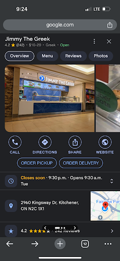 At 8:55 PM, I placed an order at the food court (Jimmy The Greek) and received my food by 9:00 PM. As I was peacefully eating, a mall security guard abruptly approached me at 9:10 PM and forced me to leave the food courtâdespite the fact that the mall clearly posts its closing time as 9:30 PM.