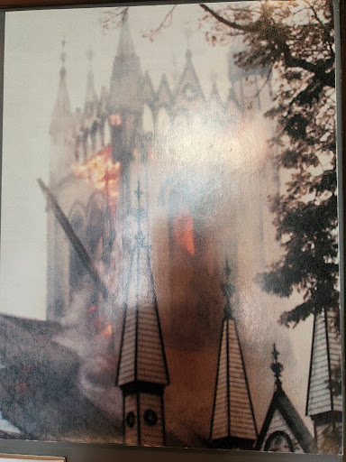 We were told that the pews and the wood floor were the only parts of the building that were saved. Also one of the stained glass windows was remade from the broken pieces collected by the Lunnenburg residents nest the bay in the water runoff from the fire fighters water used to extinguish the fire!