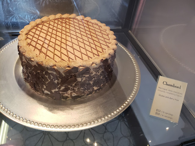 The Raspberry Hazelnut Meringue cake comes out frozen. Defrost time in room temperature is about an hour. In the fridge, the owner says about 3 hours. The cake comes in 2 sizes, a 10 serving at $33 and 16 serving at $50. The appearance of the cake is honestly isn't that appealing. Cream and some raspberries on top. Leftover bits of meringue cover the sides. The Meringue is amazingly light and fluffy. The cake is not to sweet and the layers of meringue, raspberries and creme are a perfect combination. Just enough tartness and sweetness balance everything...