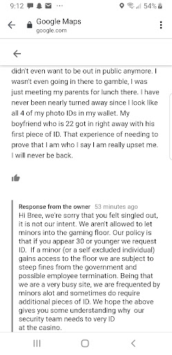 Read moreI understand the need to check ID but this experience was excessive. I am 21 years old and needed to show 4 pieces of photo ID, 4 credit cards/debit cards with my name on it and have her check my signature. And the lady STILL hardly believed it was me. I've had some skin issues recently and the fact this lady thought my acne was so bad I wasn't even recognizable made me so self conscious I didn't even want to be out in public anymore. I wasn't even going in there to gamble, I was just meeting my parents for lunch there. I have never been nearly turned away since I look like all 4 of my photo IDs in my wallet. My boyfriend who is 22 got in right away with his first piece of ID. That experience of needing to prove that I am who I say I am really upset me. I will never be back.