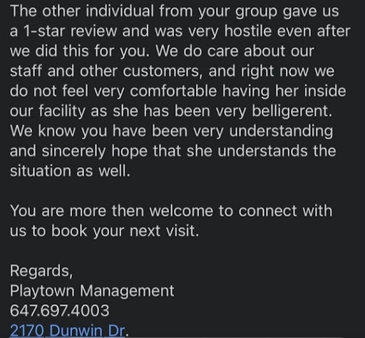 To give some context of the situation, yes the play place was double booked by two birthday parties … with about 30 people each party…Instead of trying to accommodate both parties, the manager of the place had forced us to leave. When it was left up to both parties to have a joint birthday party as to not ruin the experience for our children, the manager continue to be berating and use her on site employees who, by the way, couldn’t have been older than 16 each to do her dirty work by trying to kick us out … irregardless both family shared the space, like good neighbours…we shared in the experience of our children’s birthday.