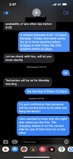 They damaged our brand new kitchen table and still havenât sent anyone to fix it. I have two items that needed to be hung on the wall and they STILL havenât sent anyone to do this simple job. We bought two nightstands with built in phone chargers and they delivered two of same right handed night tables so the charger is on the same side for both. Ridiculous oversight but common sense seems to be wasted on them.