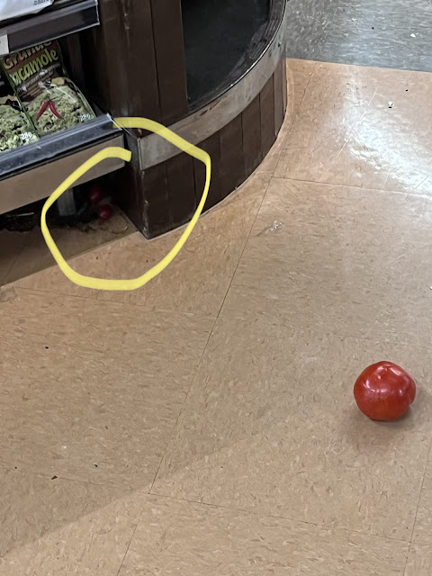 In the produce aisle, we witnessed a full grown tomato on the floor. Will the workers throw it away or simply place it back? It remains to be seen and we did not stick around to find out. However, two smaller tomatoes were noticed hiding underneath the produce table. Absurd.